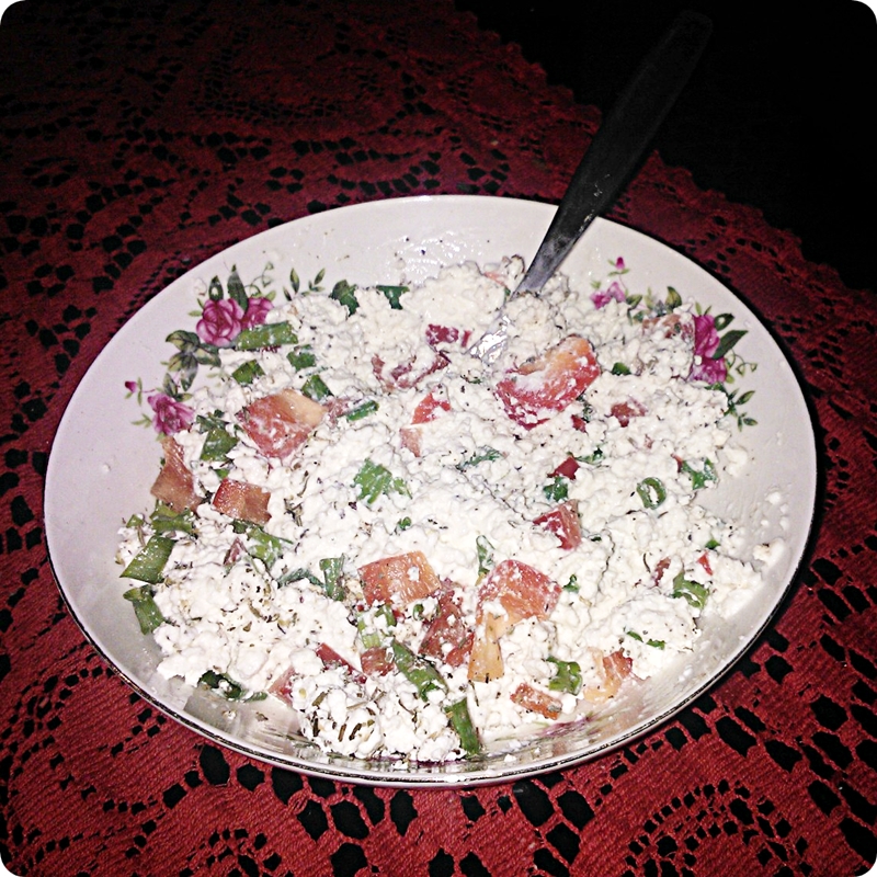 na śniadanie pyszny twarożek z papryką, szczypiorkiem i ziołami prowansalskimi. muszę zauważyć, że otwierając dzisiaj lodówkę i chcąc wyjąć żółtą paprykę, okazało się że nie ma! myślę sobie jak to możliwe, przecież do wczorajszej sałatki poszło tylko pół, tak jest w jadłospisie. myślę myślę i dopiero do mnie dotarło, że przecież robiłam podwójną porcję, dla mnie i mojego chłopaka. no nic, wzięłam czerwoną i zamiast 1/2 dałam 1/3 (bo jest bardziej kaloryczna). było na prawdę dobre i sycące.